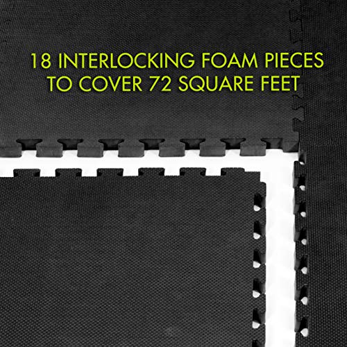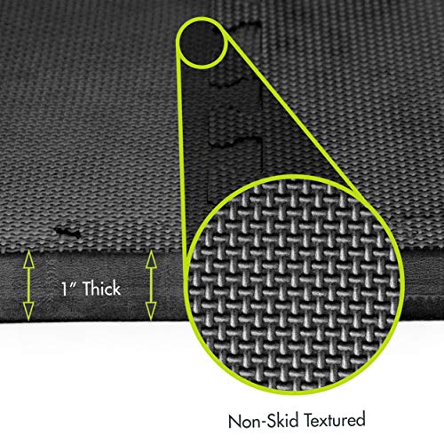 Transform any space into a comfortable workout area with the ProsourceFit Exercise Puzzle Mat ¾” or ProsourceFit Exercise Puzzle Mat 1″. Six extra-thick tiles create protective flooring over wood, concrete or carpet for workouts and gym equipment. This is the perfect solution for anyone looking for an exercise mat or multipurpose flooring thicker than ½” thick. Both mats have great durability, but the 1″ creates more protection for heavier gym equipment and higher traffic. The textured surface has a soft feel with non-skid traction that is low-maintenance. Interlocking pieces are easy to assemble, covering 24 square feet. 12 border pieces help to create a flawless finish. Built to absorb impact and provide cushion to sensitive joints while reducing noise. EVA foam contains no toxic phthalates. Use just a few tiles for smaller spaces, or purchase multiple sets for large areas. Perfect for fitness studios, home gyms, commercial use, children’s play areas, gymnastics or wrestling practice, yoga and more!
