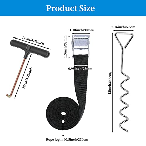 Size: Trampoline anchors (Diameter 8mm, length 42cm, handle width 8.5cm, spiral diameter 42mm). Adjustable safety straps (Width 2.5cm, length 2.5m, weight 90g, tape nylon, tightener is made of zinc alloy).