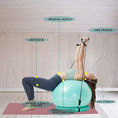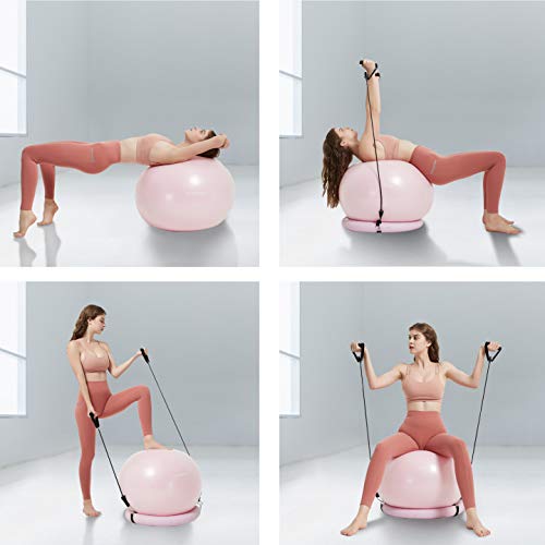 ALL IN ONE SET: Package includes yoga ball with base, resistant band set, air pump (very easy to inflate the ball by foot) and plug remover. A great choice for beginners and professions, also a thoughtful gift for your friends and family