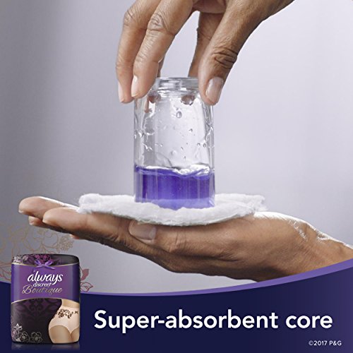 Discover the secret to maximum incontinence protection, that’s actually pretty, with Always Discreet Boutique Incontinence Underwear. The secret? Hidden inside is a super absorbent core that turns liquid to gel to absorb even your heaviest leaks. The curve-hugging, feminine design that defines your silhouette is made of silky-soft fabric with delicate, lacy prints, so it looks, fits, and feels like your real underwear. So you can feel protected and pretty, unlike adult diapers. It’s maximum protection, you can depend on, made beautiful.