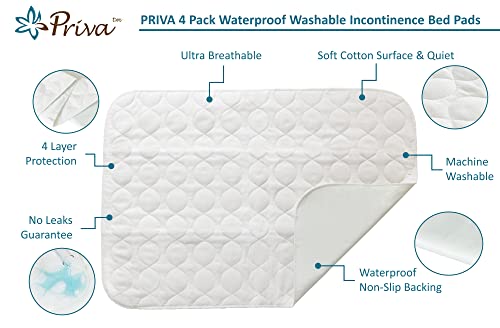 The PRIVA waterproof washable incontinence bed sheets have 4 layers of protection to keep you and your bed dry from bedwetting. A quiet vinyl non-slip bottom layer on the mattress protector keeps the underpad in place while an ultra-absorbent leak-proof middle layer absorbs any liquid. A quilted cotton/polyester top surface of the sheet protector combined with a padded polyester fiberfill layer keeps you feeling dry and comfortable. The bed pad is big to maximize the area of protection and can be machine washed and dried for reuse up to 300 times. It is great for elderly seniors, adults, kids and pets and can be used to protect wheelchairs, car seats, or furniture.
