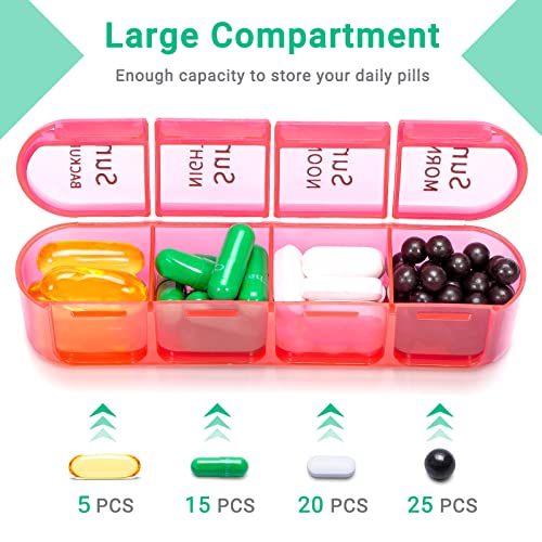 [Easy to track] The travel pill organizer 28 day has conspicuous time marks, visible compartments and bright colors that help to keep on track of meds. It’s easy to read and handy to classify pills.