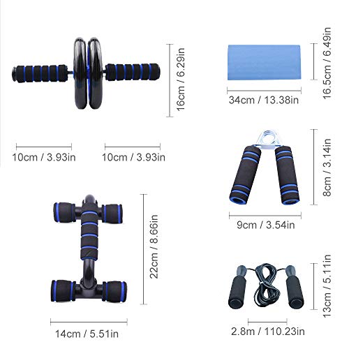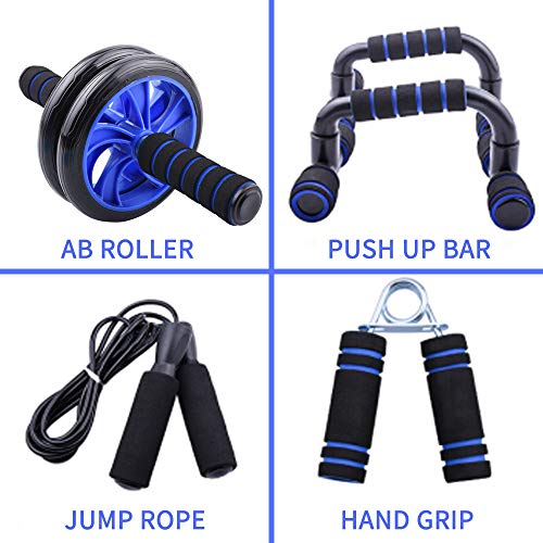 4 IN 1 HOME GYM EQUIPMENT: 4 in 1 ab wheel roller set included 1 x AB Roller Kit with Knee Pad , 1x Sponge Push-Up Bar, 1x Adjustable Jump Rope, 1x Type A Hand Gripper, It is ideal for burning calories and building muscles. It is very suitable for everyone who wants to enhance core strength and build a better body