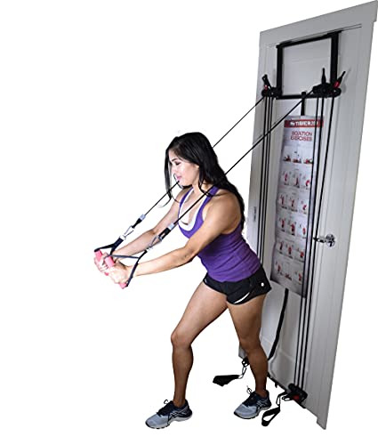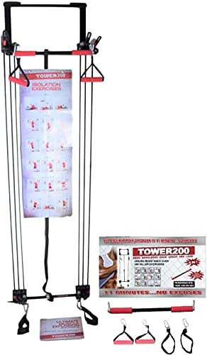 [Heavy Duty Resistance Power Cords] Tower 200 Complete Training Equipment is a Door-based home gym that is innovatively designed for working out your upper and lower body, that includes over 200 workouts for the Ultimate Total Body Workout System! This Full Home Gym Exercise Equipment is designed workout your arms, chest, back, shoulders, abs, and legs! 3 Resistance Multi-Tension Levels 15LB, 30LB and 45 LBS! Designed to work out all your muscles with a variety of strength training exercises using the Multi Tension Power Cords that provide 200 pounds of explosive resistance! The Resistance Power Cords are made from Stranded Rubber for consistent resistance during your exercise. Supports more than 200 exercises in all; with a Heavy Duty durable steel frame! This door gym includes 6 Multi Tension Door Mounted strong resistance bands, one straight workout bar for squat and curls , Two Ankle/Wrist Straps, four metal locks, Two Padded Handles, and an innovative exercise workout Chart. It is a complete home gym equipment system for your exercise needs. Slides onto any home, office, or dorm door within seconds! Includes: 2x Hand Grips, 2x Ankle Straps, 1x Exercise Chart, DVD + BONUS, STRAIGHT Wide Metal BAR. The included Carabiner Hooks on your Workout Handles, Ankle Straps, and Straight Bar allow you to attach them onto your Power Cords to target any muscle in your upper and lower body. The Tower 200 All in One Fitness Equipment is perfect for Men and Women of all ages and skill level. This Complete Home Gym allows you to Train all your muscles with a variety of strength training exercises using the Multi Tension Power Cords that provide 200 pounds of explosive resistance to help you build muscles, burn fat, build strength, endurance, increase balance and flexibility, while toning and shaping your entire body!