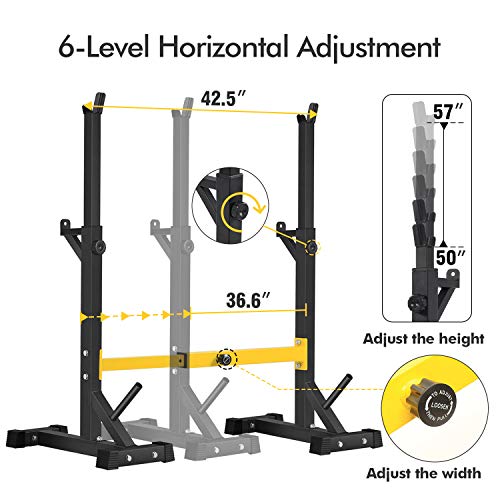 Height Adjustable: Adjustable Barbell Rack that suitable for a variety of height requirements. Bracket Height range of 52.5”-61”, Adjust the spotters to fit your height need.