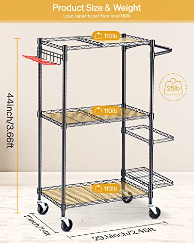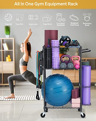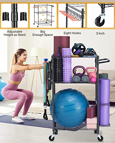 👍【Multifunction Home Gym Organizer】 The workout equipment storage is equipped with 3 layers of metal mesh storage area, a side basket, a side of hooks, a cart handle and load-bearing moving wheels that are convenient for your mobile. The dimension of this workout organizer is 34.5”(L) x 16”(W) x 46.5”(H).